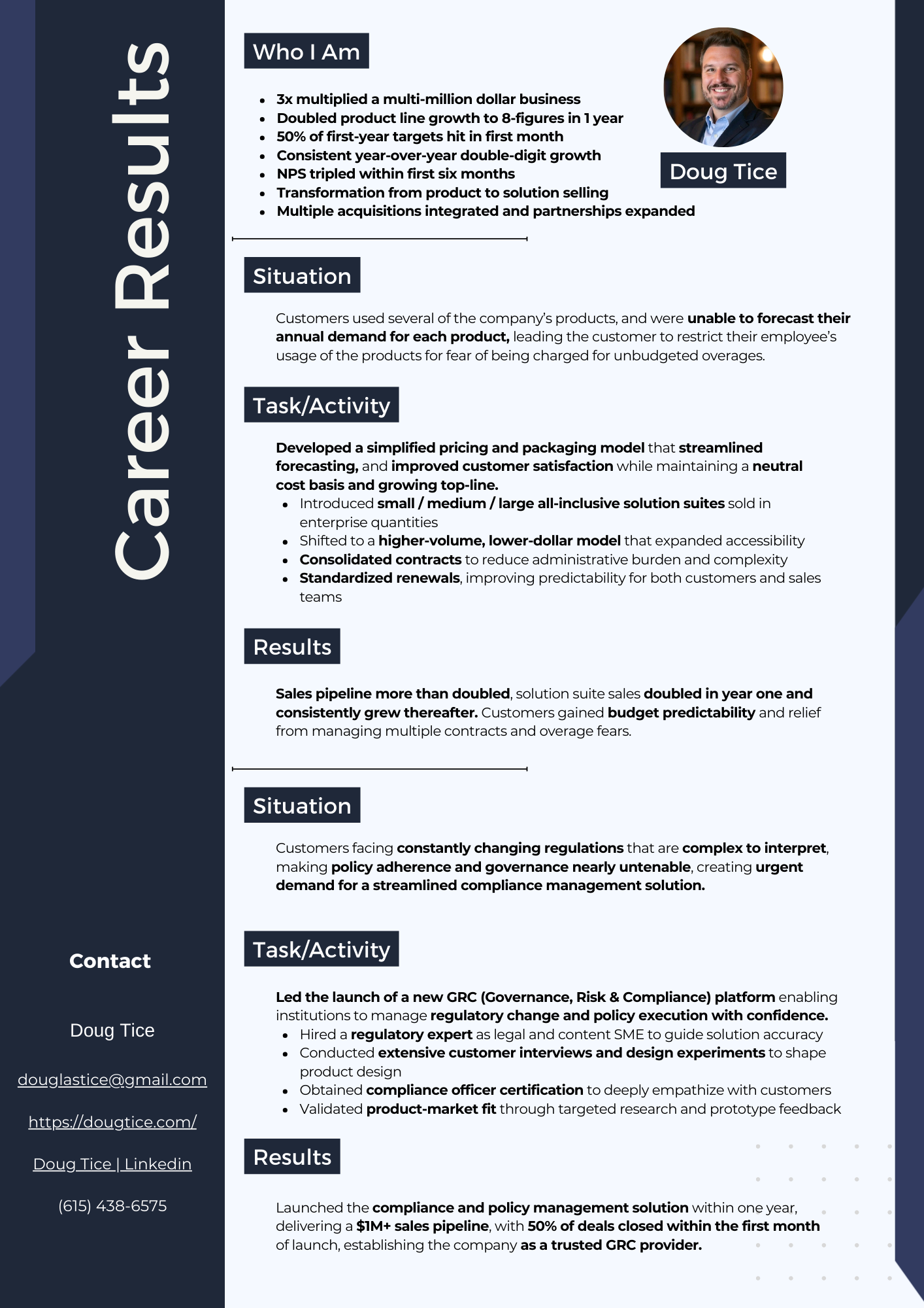 Also launched a SaaS product that hit 50% of first-year targets in its first month, tripled NPS in six months, and drove 5 consecutive years of double-digit growth.